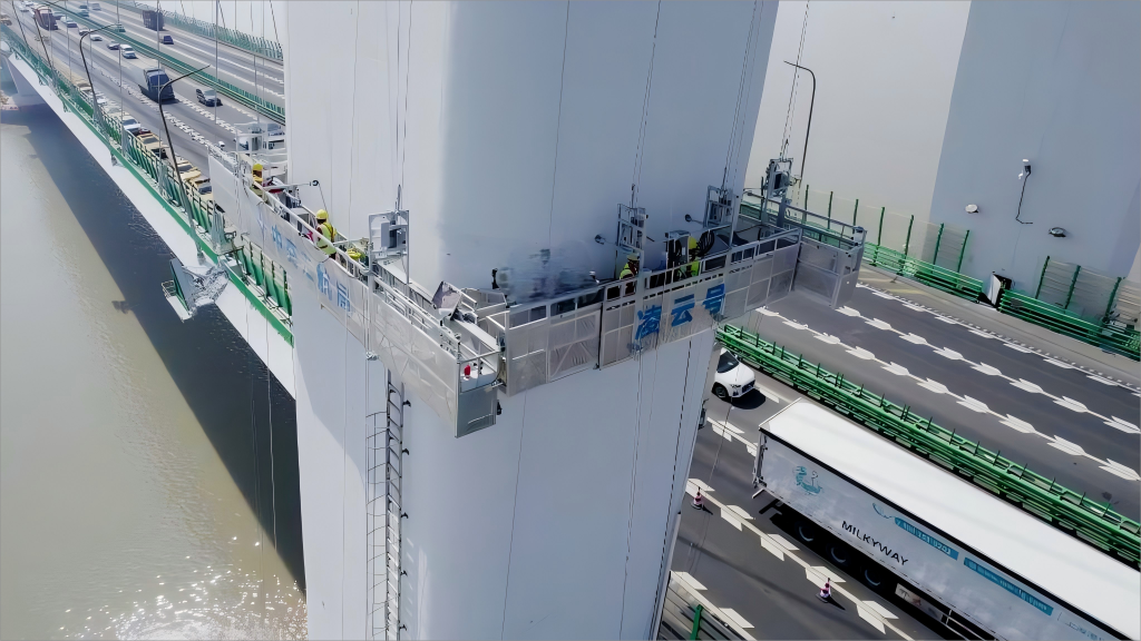 在索塔维修现场,全国首套自主研发的三级智控检修平台正高效运转,成为一道引人注目的风景线。这套平台采用了模块化组装设计,如同搭建积木一般,可根据不同的维修需求灵活组合,大幅度的提升了施工的便利性和适应性。